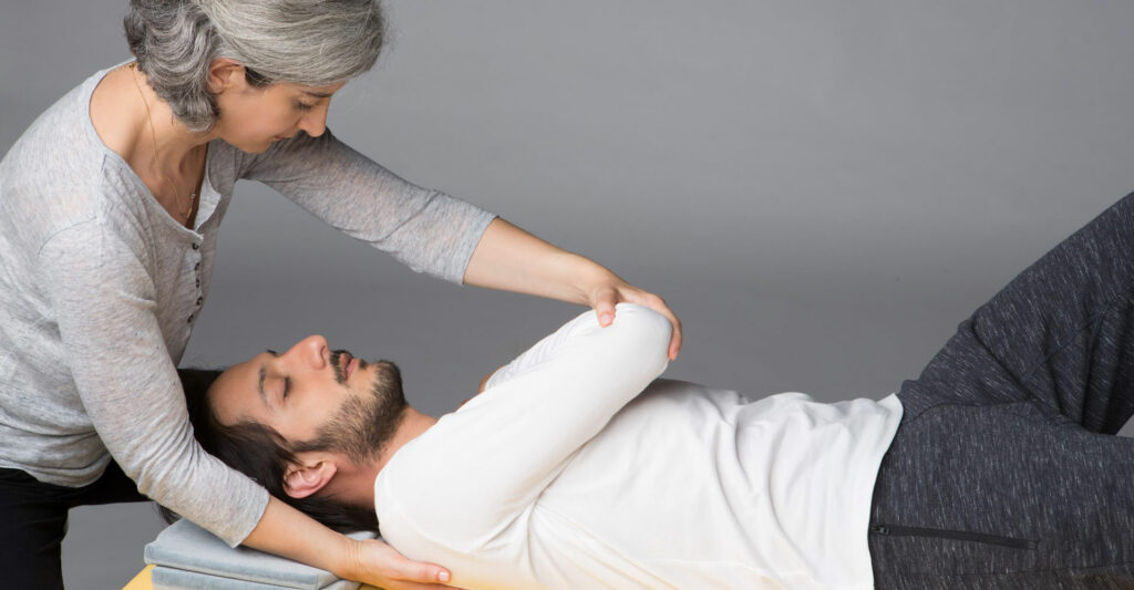 Elle apprend à orienter son attention vers soi, à laisser sa masse corporelle se déposer pour retrouver, dans le présent, du soutien et de la sécurité.